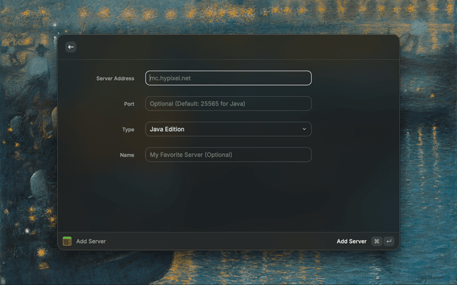 Quickly check the status, MOTD, version, latency, player count, and list of players (when available) of Minecraft servers! Supports Java and Bedrock servers.