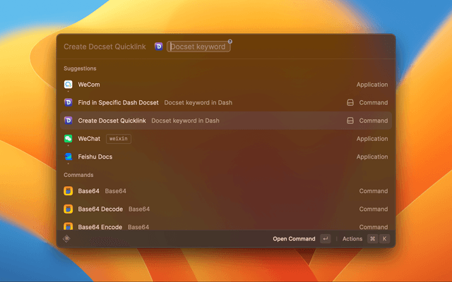 Create Docset Quicklink command, enter the docset keyword you want to create forEnter to create the quicklinkExtension panel, find the link you just created in the Quicklinks groupalias or a Hotkey, and you are doneIf you don't want to create an alias for every docset but still want to search in a specific docset, use the Find in Specific Dash Docset command, just enter the docset keyword and open the command and everything you search for will be within that single docset.