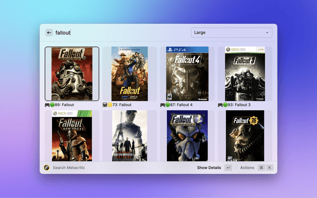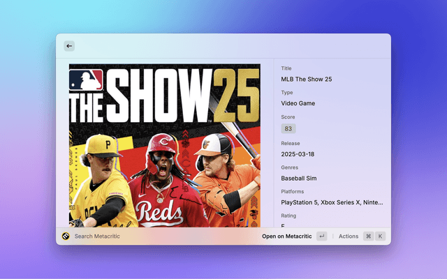 This Raycast extension lets you quickly search Metacritic's autosuggest API and browse results in a visual grid. Each item displays: