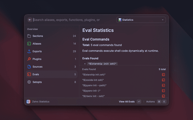 | 📝 | Section Management | View zshrc content organized by logical sections with detailed breakdowns |