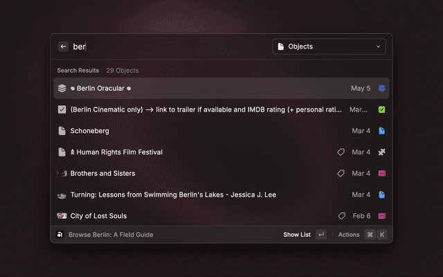 - Interact: Press Enter to view the object in Raycast or Command+Enter to open it in Anytype.