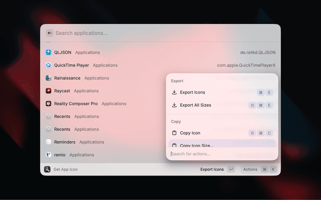 ⌘G / ⌘L.~/Downloads/..icns file). Multiple formats can be enabled at once.⌘E): Exports all enabled sizes to the app's folder in the configured formats.⌘⇧E): Exports every size (16–1024) regardless of preferences, as a one-off.⌘⇧C): Copies the app icon at the largest enabled size to the clipboard as an image. You can paste it directly into design tools, documents, or chat apps.⌘.): Copies the full path to the .app bundle.⌘⇧.): Copies the app's display name.com.apple.Safari).⌘G) / View as List (⌘L): Toggle between list and grid views. Your choice is remembered across sessions.⌘↩): Reveals the app in Finder.⌘I): Opens the Finder info window for the app.⌘F): Opens the app's export folder in Finder (if icons have been exported).Assets.car) instead of traditional .icns files. PNG and JPEG export works for all apps, but ICNS export requires the original .icns file to be present in the app bundle.