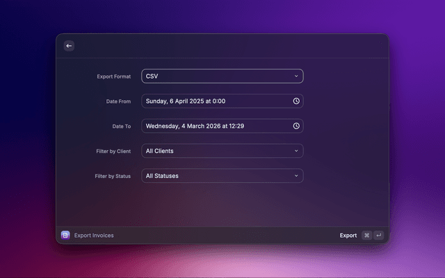 - Export Invoices - Export filtered invoice data as CSV or a PDF summary report. Useful for tax returns and bookkeeping.