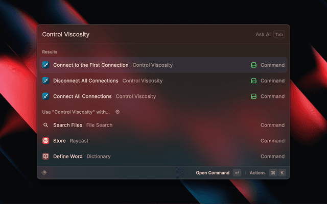 Allows you to control Viscosity VPN client and connect to or disconnect from your VPN connections.