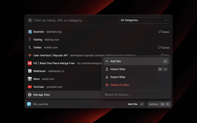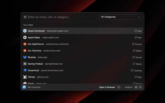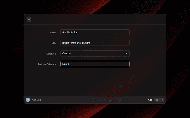 We can create a series of sites with the category “News” and then every time you want to browse your tech news sites, you can either type “news” or select the “News” category from the Category dropdown menu.