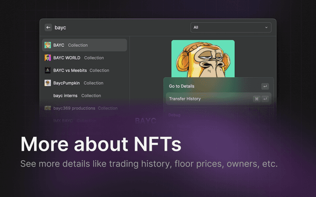 - See NFT collection details (metadata, tags, floor price, transfer history, etc.)