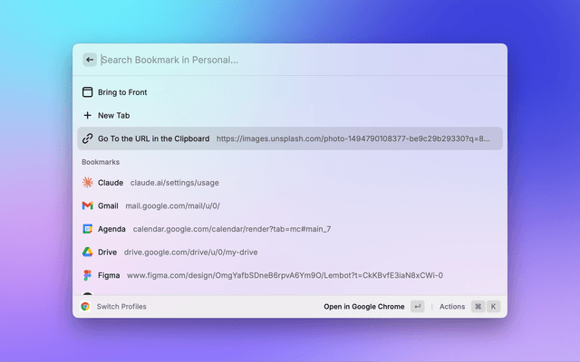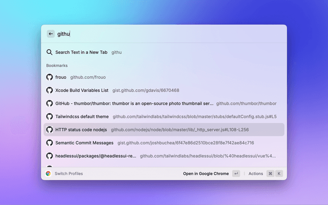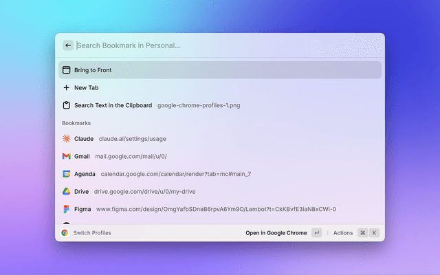 Hit Enter ↵ to enter a profile's bookmarks, or ⌘ ↵ to open (or focus) the profile chrome window.