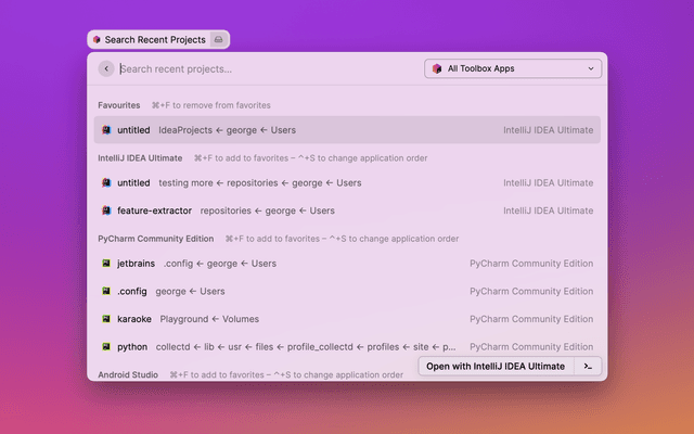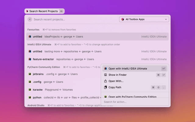 This extension should work out of the box. If you have multiple JetBrains apps installed, you can choose a priority app to bump to the top of the list in preferences.