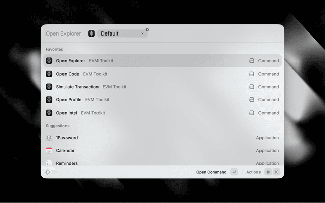A Raycast extension for EVM power users. Copy an address, transaction hash, or block number into your clipboard and instantly open block explorers, read contract source code, check portfolio balances, look up wallet analytics, or simulate transactions across 24+ networks.