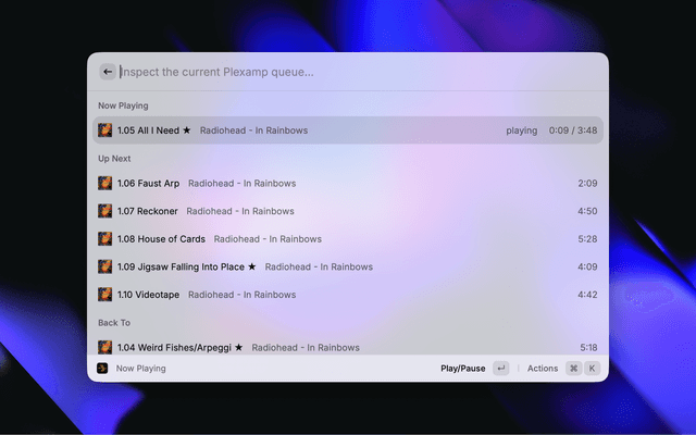 Browse Library: browse the selected Plex music library, artists, albums, playlists, and queue tracks or entire albums in PlexampSearch Library: quickly search artists, albums, and tracks and play/queue them in PlexampNow Playing: see what's playing, control the transport and adjust the queueNow Playing Menubar: show the current album art and a customizable now playing label in the macOS menu barPlexamp Status: inspect the connected Plexamp client and selected Plex music libraryPlexamp URL Override if your Plexamp or Plexamp Headless instance is not available at http://127.0.0.1:32500.Menubar Format with {track}, {album}, and {artist} tokens for the Now Playing Menubar command.Now Playing.Now Playing.Plexamp Status.5 Stars, 5 Stars (Half Stars), or 1 Star.