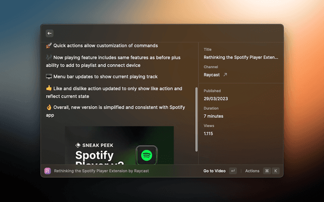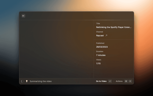 Summarize any YouTube Video with AI. Choose between Raycast, OpenAI or Anthropic. You have to either be a Raycast Pro Member or have an OpenAI/Anthropic API Key.