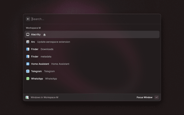 aerospace config --config-path)Aerospace to view the available commandsAerospace Shortcuts command to view all shortcuts parsed from your config fileAerospace Configuration command to view your Aerospace configurationAerospace Menubar Shortcuts command to enable menubar shortcutsAerospace Switch Apps command to show the app in current workspaceThe extension supports programmatic access via Raycast deeplinks using launchContext. This allows integration with window tile manager tools like SketchyBar, Alfred, Keyboard Maestro, or custom scripts.