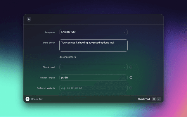 Raycast extension that provides instant spelling and grammar correction using LanguageTool. Type any text, get real-time suggestions, and copy the improved version. Ideal for developers, writers, and anyone who wants fast, high-quality text corrections in multiple languages.