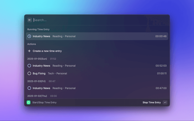 - By pressing "Enter" on a time entry, you can start/stop the time entry.