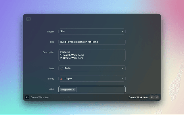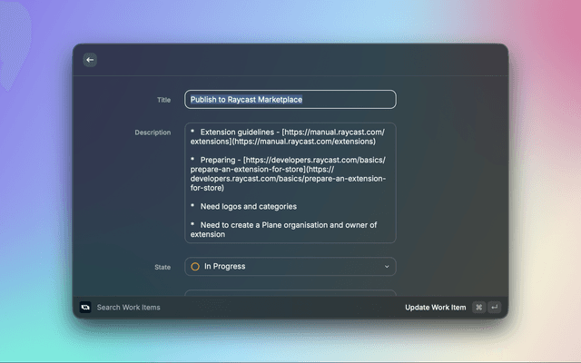 A powerful Raycast extension for managing work items in Plane, the open-source project management tool. This extension allows you to create, search, view, and manage work items directly from your macOS command palette.