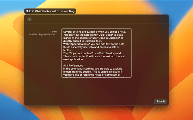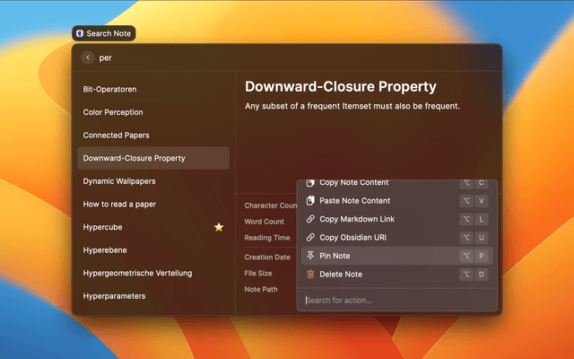 opt + enter will open the notes path in Finderopt + e will let you edit the note (supports templates)opt + d will let you delete the noteopt + a will let you append text to the note (supports templates)opt + s will append selected text to the note (supports templates)opt + c will copy the notes content to your clipboardopt + t will copy the notes title to your clipboardopt + v will paste the notes content to the app you used before raycastopt + l will copy a markdown link for the note to your clipboardopt + u will copy the obsidian URI for the note to your clipboard (see: Obsidian URI)opt + p will bookmark a noteopt + p will "unbookmark" a bookmarked noteThe primary action (enter) can be changed in the extensions preferences.