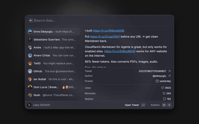 View your X/Twitter bookmarks and likes in Raycast using the bird CLI.
