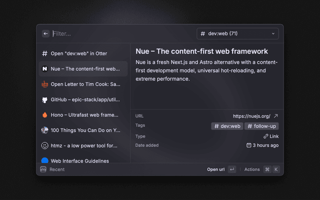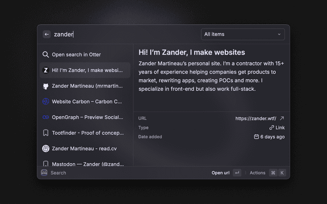 loginEmail - your Otter login email addressloginPassword - your Otter login passwordotterBasePath - the base URL of your Otter instancesupabaseUrl - your Supabase project urlsupabaseAnonKey - your Supabase project anon API keyshowDetailView - whether to show the detail view or list view when searching for bookmarksThis extension relies on an instance of Otter being setup and running. You can find the source code for Otter here. The Otter app is built with React, Next.js and Supabase.