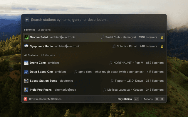 Note: "SomaFM" is the correct branding for this service. The Raycast linter may suggest "Somafm" but we're keeping the official branding.