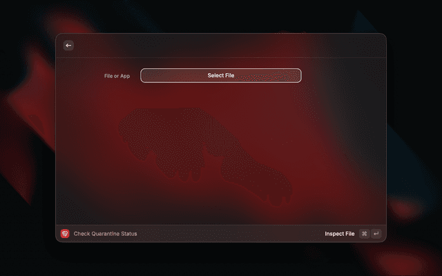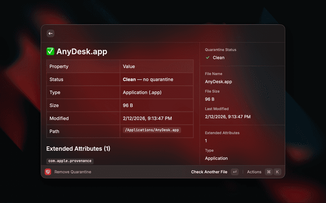 Opens a file picker (or uses your current Finder selection), then shows a full breakdown of the file's quarantine status and extended attributes. From there you can remove the quarantine flag in one action.