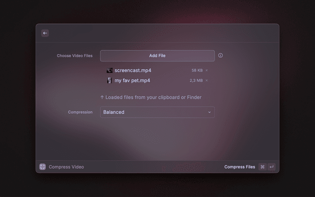Compress videos easily from Raycast. Zero config. From your clipboard, or the Finder.