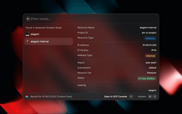 Enter - Open in GCP Console (in result view) / Configure Custom Projects (in Custom Mode Welcome view)β + Enter - Copy GCP Console URLβ + D - Toggle Details Viewβ + M - Cycle Search Modes (Quick -> Detailed -> Custom)β + Shift + P - Configure Custom Projects (Only in Custom Mode)β + X - Remove from HistoryThe extension searches for IPs in: