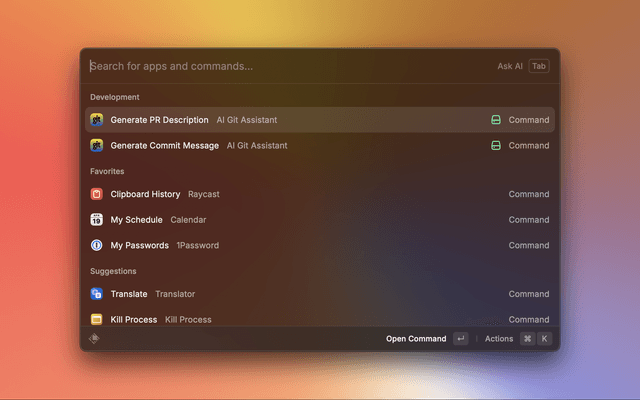 The primary function of this extension is to generate commit messages and PR descriptions using an AI. The extension is designed to be used with the Raycast app and Raycast AI.