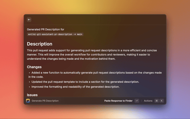 2. Calls an Raycast AI with key context details about current repository branch changes.