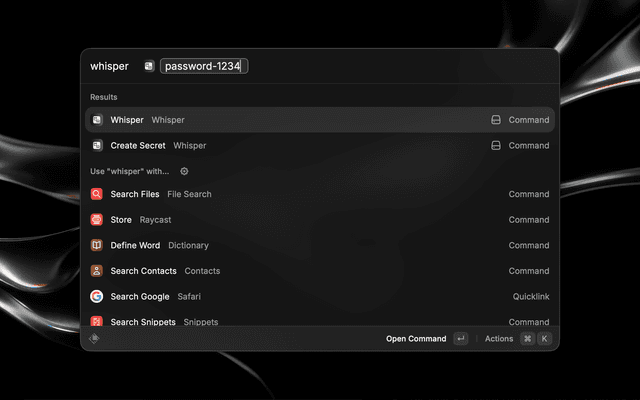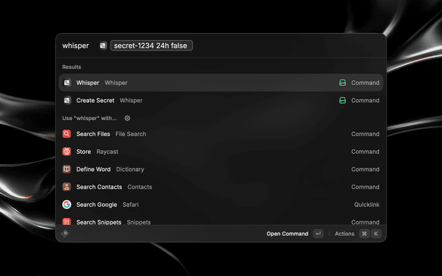 • Quick Whisper — Type your secret directly from Raycast and get an encrypted link copied to your clipboard instantly