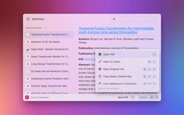 A screenshot of searching Zotero via Raycast