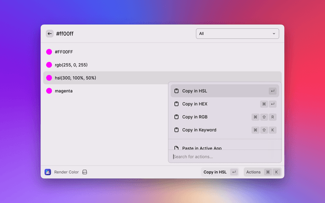 Available keywords to find commands: color, pick, eyedropper, pipette, render, render color, color utilities, color casket