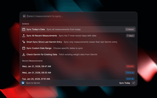 Sync your Withings health data (weight, blood pressure, body composition) to Garmin Connect directly from Raycast.