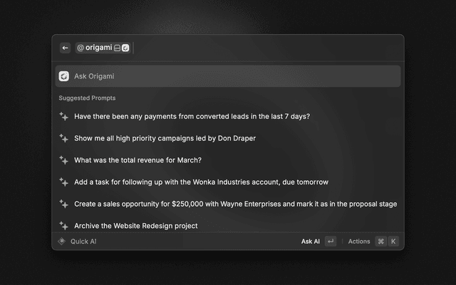 This extension integrates with Raycast's AI features, providing tools to retrieve and interact with your Origami data. You can use natural language commands to work with your Origami data directly from Raycast's AI interface, without needing to navigate the Origami web interface.
